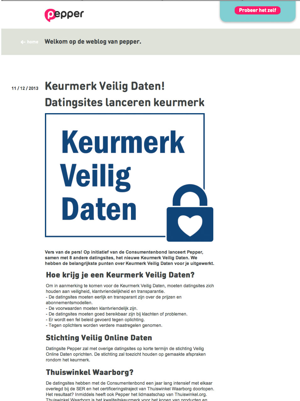 Naast Thuiswinkelcertificering hebben de betrokken partijen met elkaar afgesproken dat zij richting consumenten eerlijk en transparant zijn over hun prijzen en abonnementsmodellen, klantvriendelijke voorwaarden gebruiken, goed bereikbaar zijn bij problemen of klachten en ze zijn aangesloten bij een onafhankelijke geschillencommissie. Bovendien voeren zij een fel beleid tegen oplichting en nemen zij maatregelen om in de toekomst nog harder te kunnen optreden tegen oplichters. Ook Bart Combée, directeur Consumentenbond is blij met de afgesproken voorwaarden en het Keurmerk Veilig Daten: “Dankzij dit nieuwe keurmerk kunnen consumenten meteen zien of een datingsite veilig en klantvriendelijk is.” De datingsites die als binnenkort als eersten het Keurmerk Veilig Daten uitgereikt zullen krijgen, zijn: Lexa, Relatieplanet, Pepper, PARSHIP, Match4me, e-Matching, Paiq, 50plusmatch en eDarling.