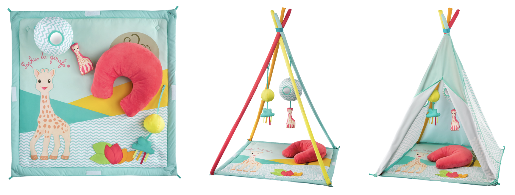 De met stof beklede steunframes kun je via een handig kliksysteem eenvoudig aan de speelmat bevestigen zodat een mooie speelboog ontstaat. Als je vervolgens de Sophie de giraf speeltjes eraan bevestigt, zal je kindje zich niet vervelen: de speeltjes rinkelen, piepen of knisperen als je ze aanraakt en het spiegeltje reflecteert je kindjes omgeving.